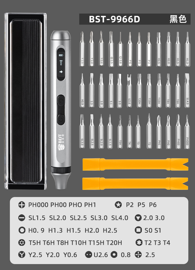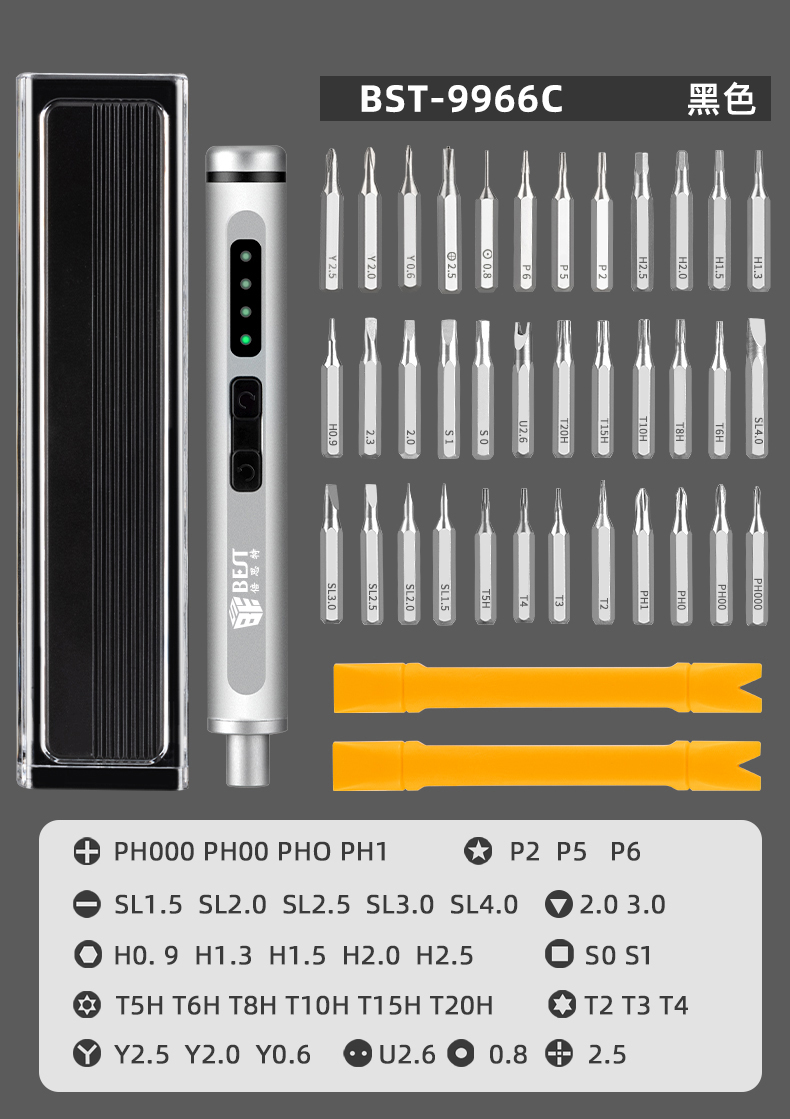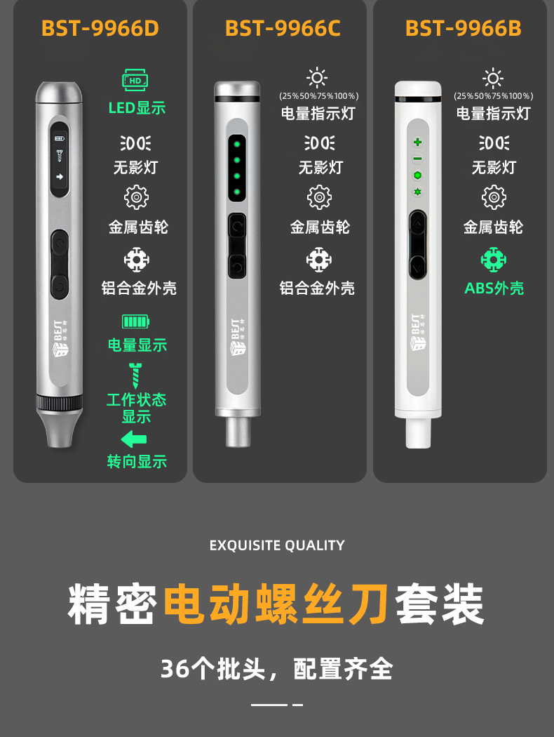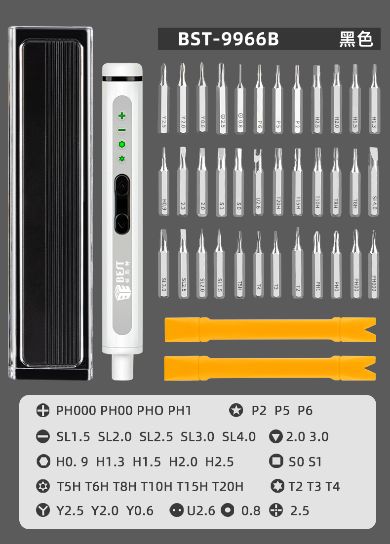 ? 產(chǎn)品名稱: 電動(dòng)精修螺絲刀套裝? 產(chǎn)品型號(hào): BST-9966B/9966C/9966D? 產(chǎn)品類別: 電動(dòng)螺絲刀系列
