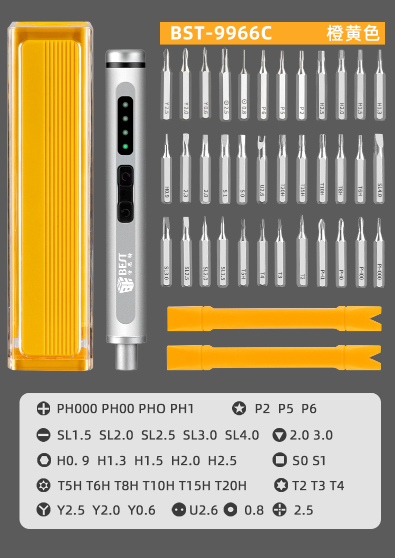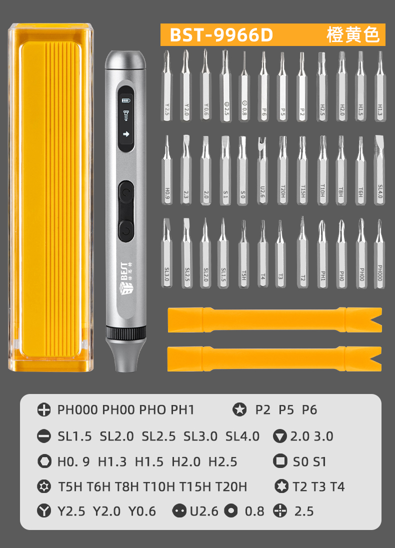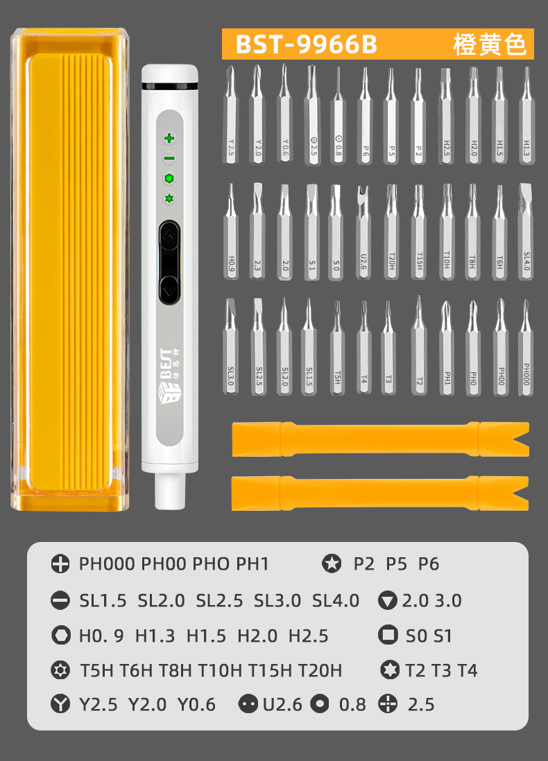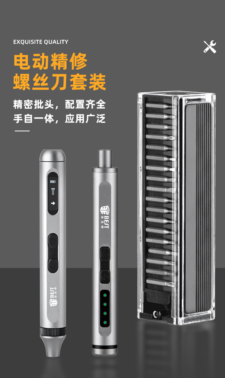? 產(chǎn)品名稱: 電動(dòng)精修螺絲刀套裝? 產(chǎn)品型號(hào): BST-9966B/9966C/9966D? 產(chǎn)品類別: 電動(dòng)螺絲刀系列