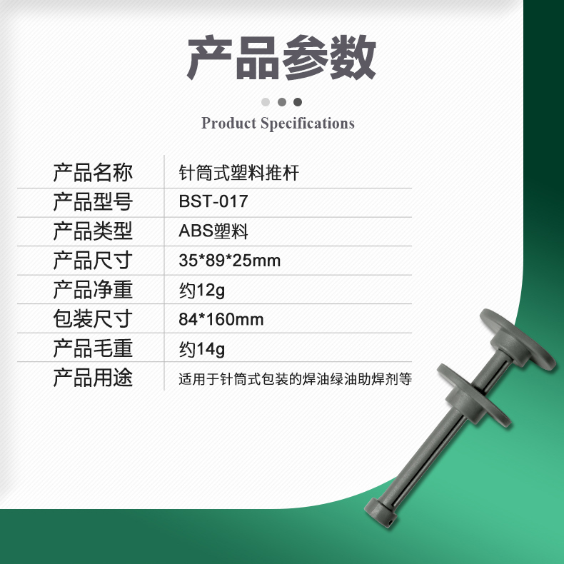 ? 產品名稱: 塑料針筒助推桿? 產品型號: BST-017? 產品類別: 錫漿焊油系列