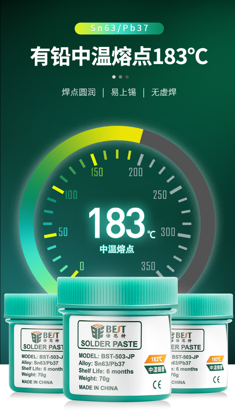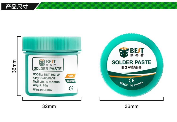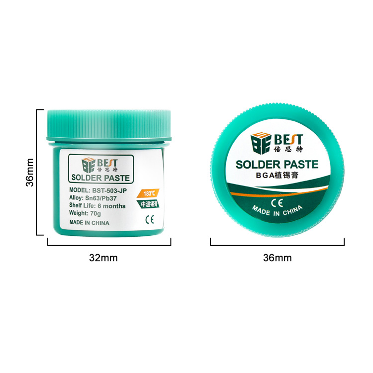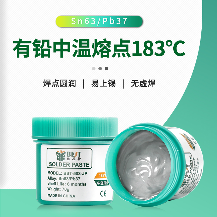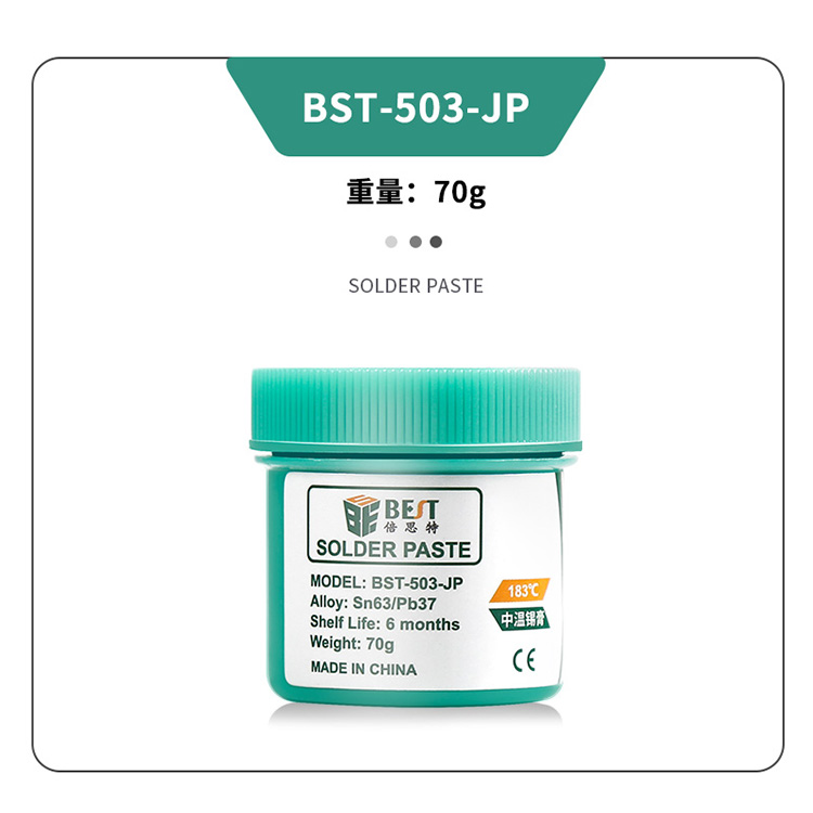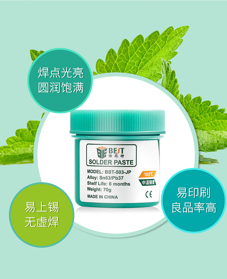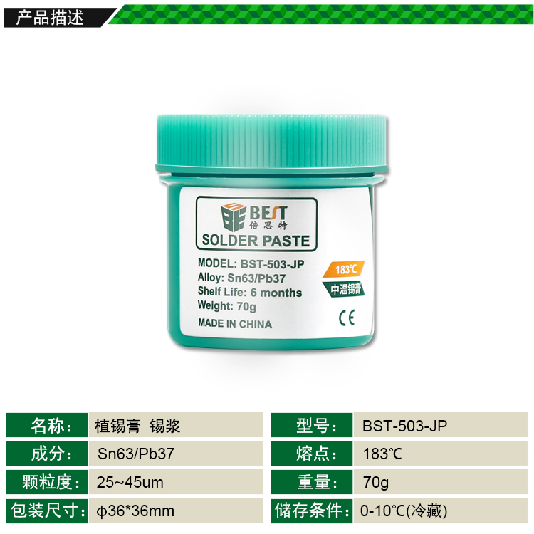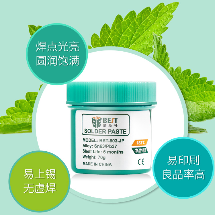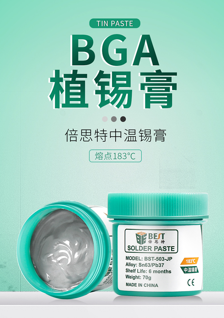 ? 產(chǎn)品名稱: 中溫錫漿 BGA植錫膏? 產(chǎn)品型號: BST-503-JP? 產(chǎn)品類別: 錫漿焊油系列? 產(chǎn)品成分: Sn63/Pb37? 產(chǎn)品重量: 70g