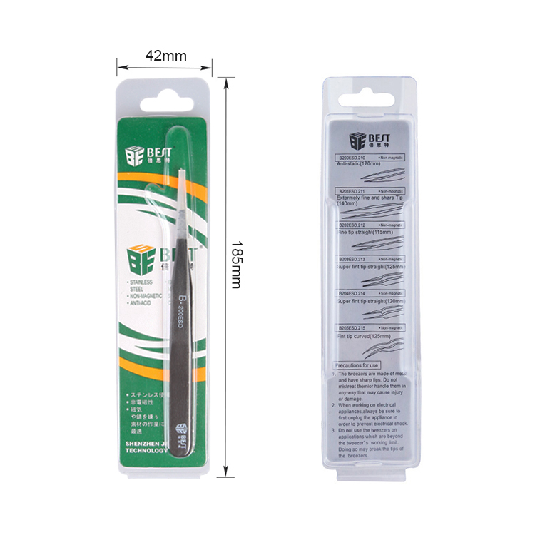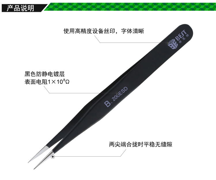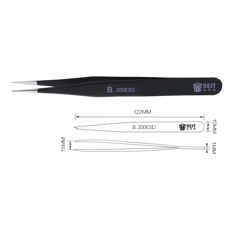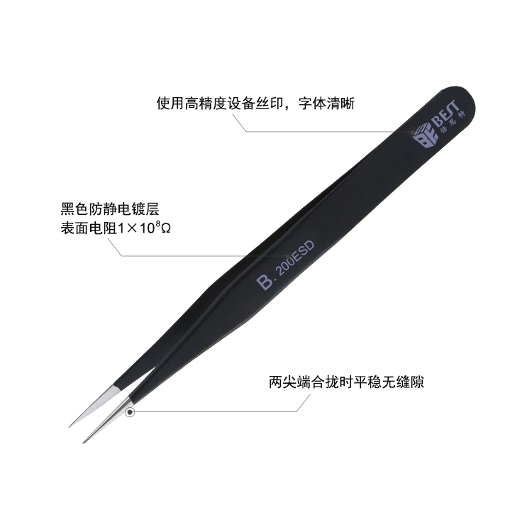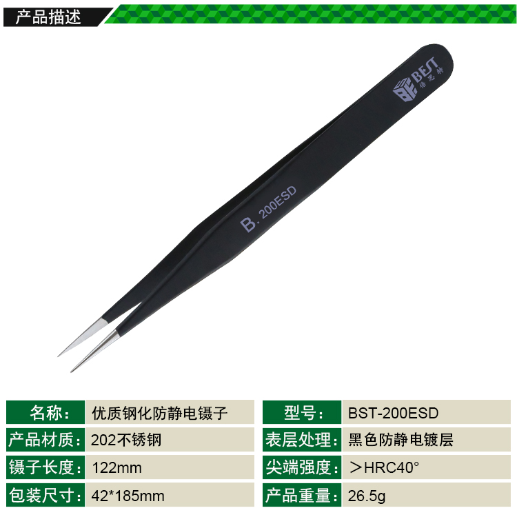 ? 產(chǎn)品名稱: 優(yōu)質(zhì)鋼化防靜電鑷子? 產(chǎn)品型號: BST-200ESD? 產(chǎn)品類別: 鑷子系列