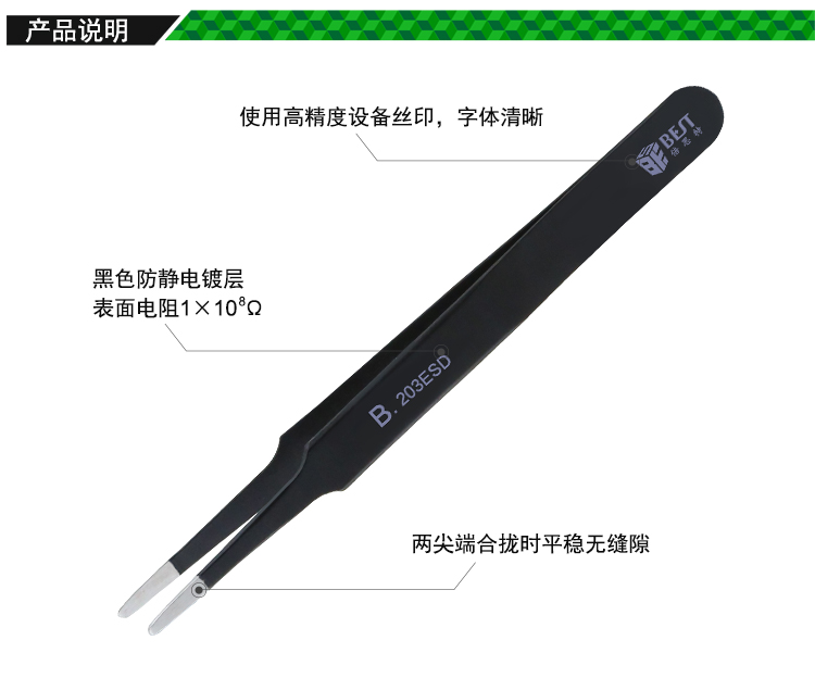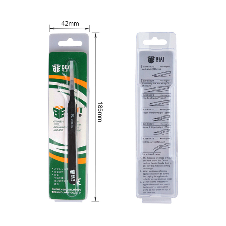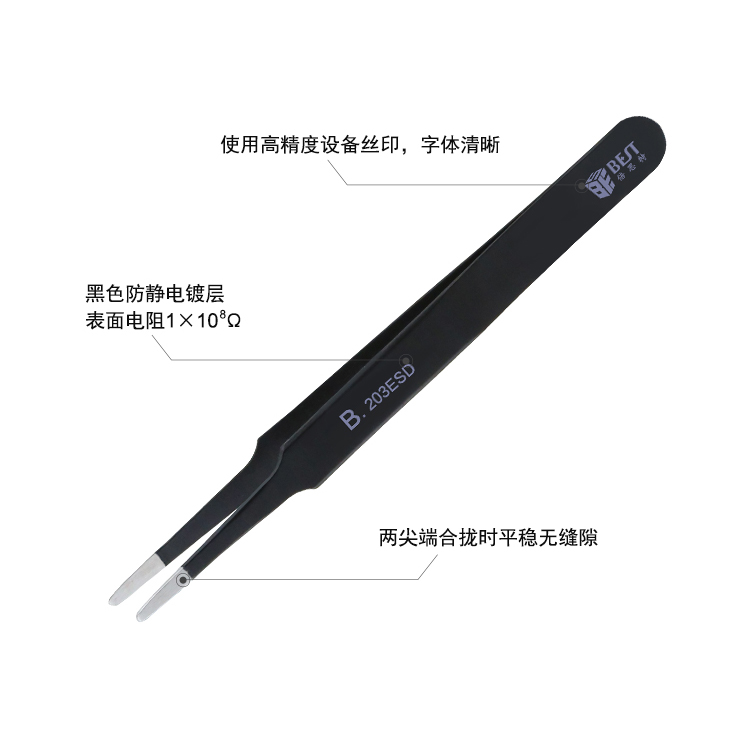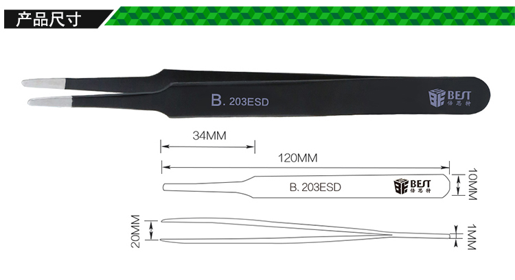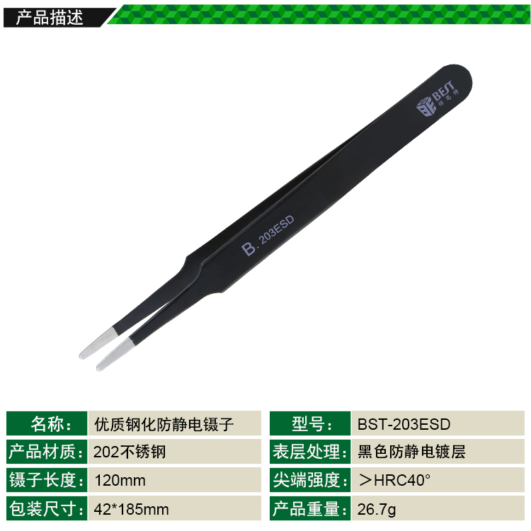 ? 產(chǎn)品名稱: 優(yōu)質(zhì)鋼化防靜電鑷子? 產(chǎn)品型號(hào): BST-203ESD? 產(chǎn)品類別: 鑷子系列