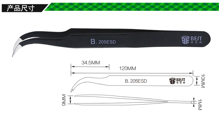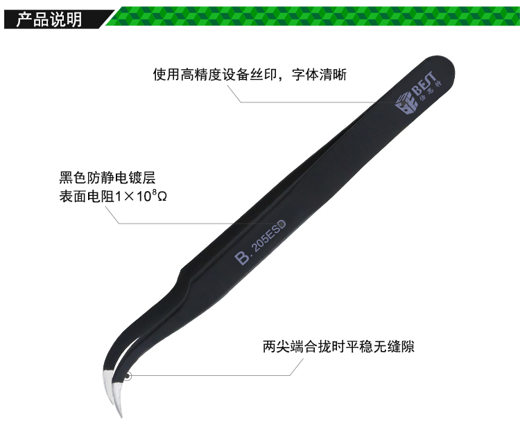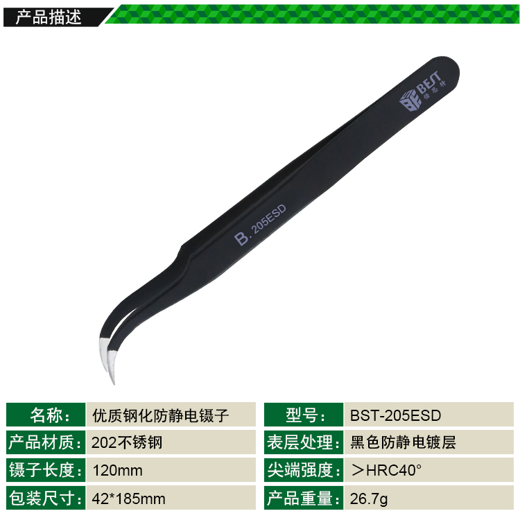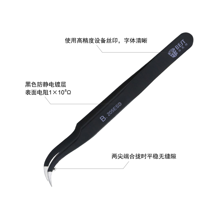 ? 產(chǎn)品名稱: 優(yōu)質(zhì)鋼化防靜電鑷子? 產(chǎn)品型號(hào): BST-205ESD? 產(chǎn)品類別: 鑷子系列
