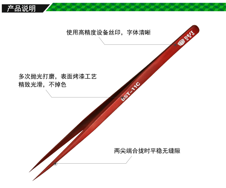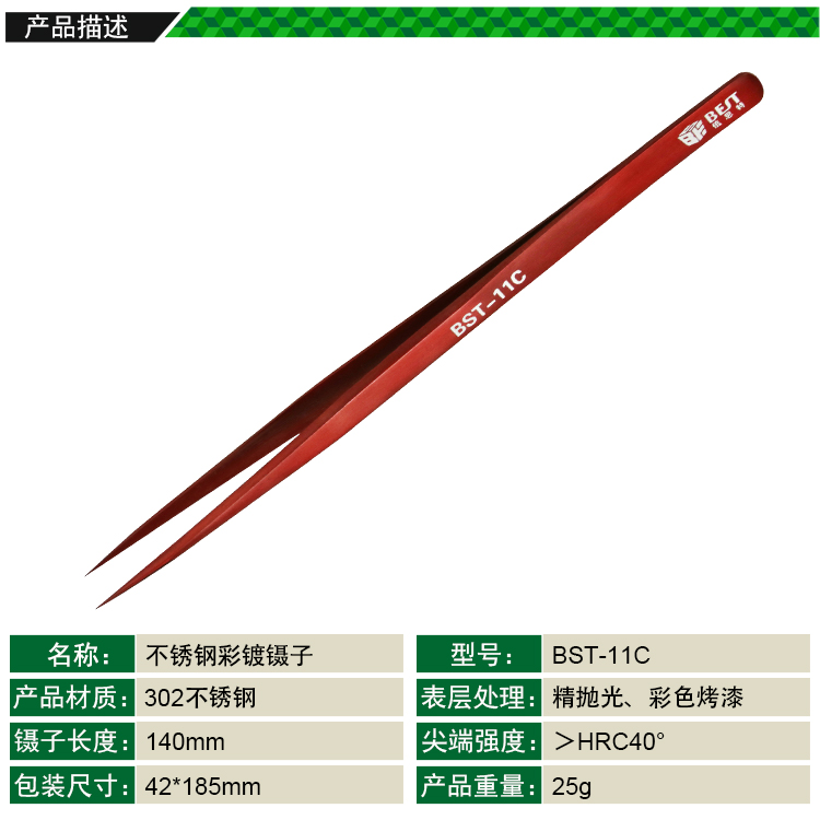 ? 產(chǎn)品名稱: 彩色鑷子 不銹鋼彩鍍鑷子? 產(chǎn)品型號: BST-11C? 產(chǎn)品類別: 鑷子系列