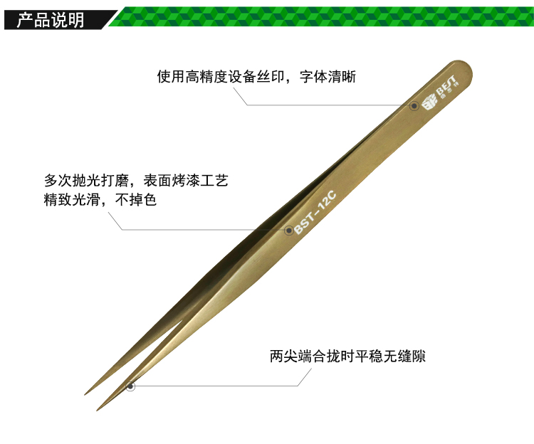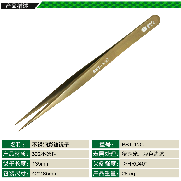 ? 產(chǎn)品名稱: 彩色鑷子 不銹鋼彩鍍鑷子? 產(chǎn)品型號: BST-12C? 產(chǎn)品類別: 鑷子系列