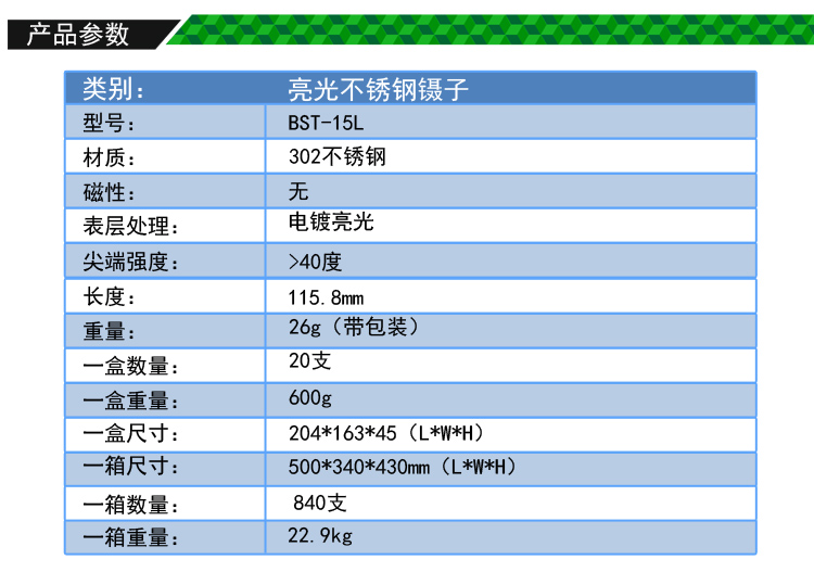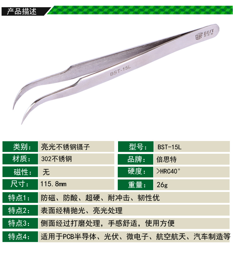 ? 產(chǎn)品名稱: 亮光鑷子 不銹鋼鑷子? 產(chǎn)品型號(hào): BST-15L? 產(chǎn)品類別: 鑷子系列