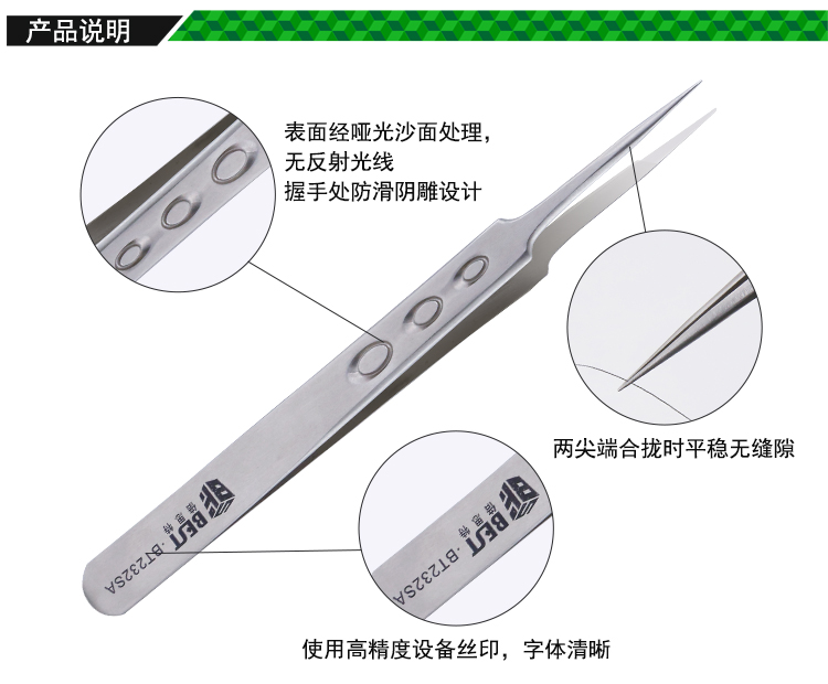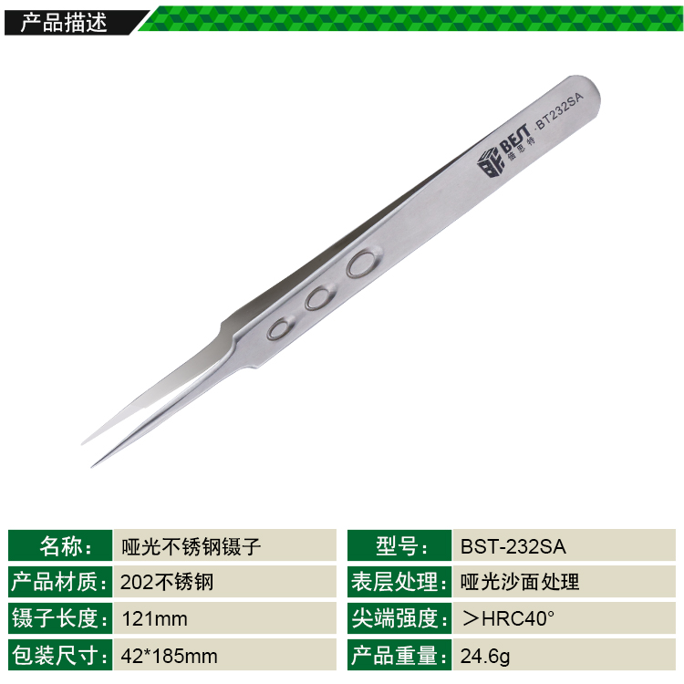 ? 產(chǎn)品名稱: 亞光沙面鑷子 不銹鋼鑷子? 產(chǎn)品型號: BST-232SA? 產(chǎn)品類別: 鑷子系列
