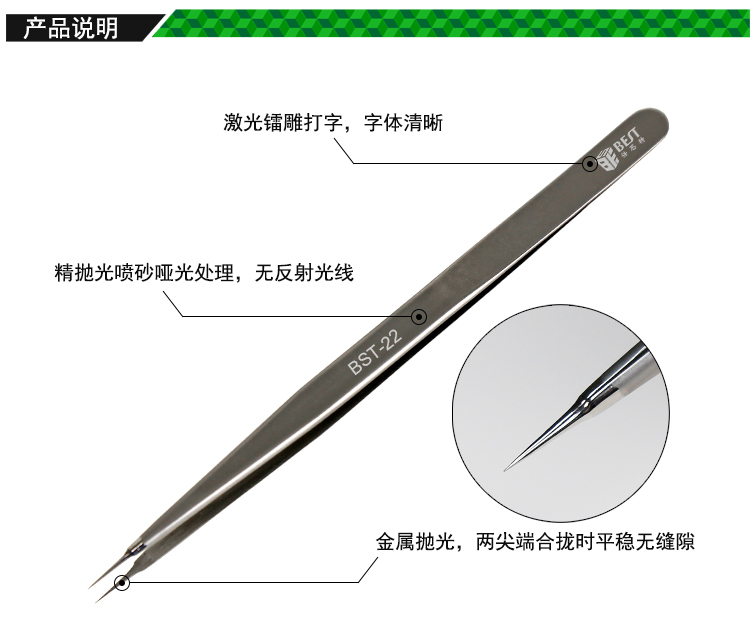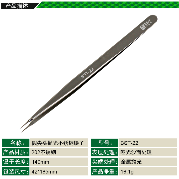 ? 產品名稱: 圓尖頭拋光直鑷子? 產品型號: BST-22? 產品類別: 鑷子系列