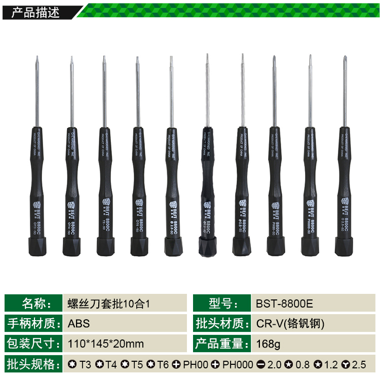? 產(chǎn)品名稱: 螺絲套批10合1? 產(chǎn)品型號(hào): BST-8800E? 產(chǎn)品類別: 螺絲批系列