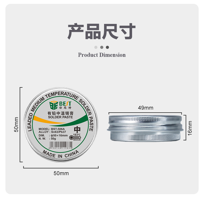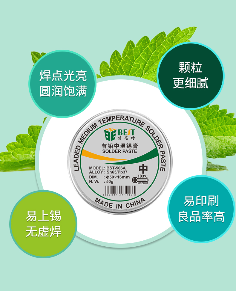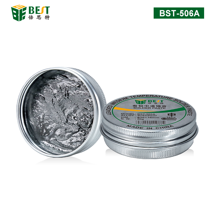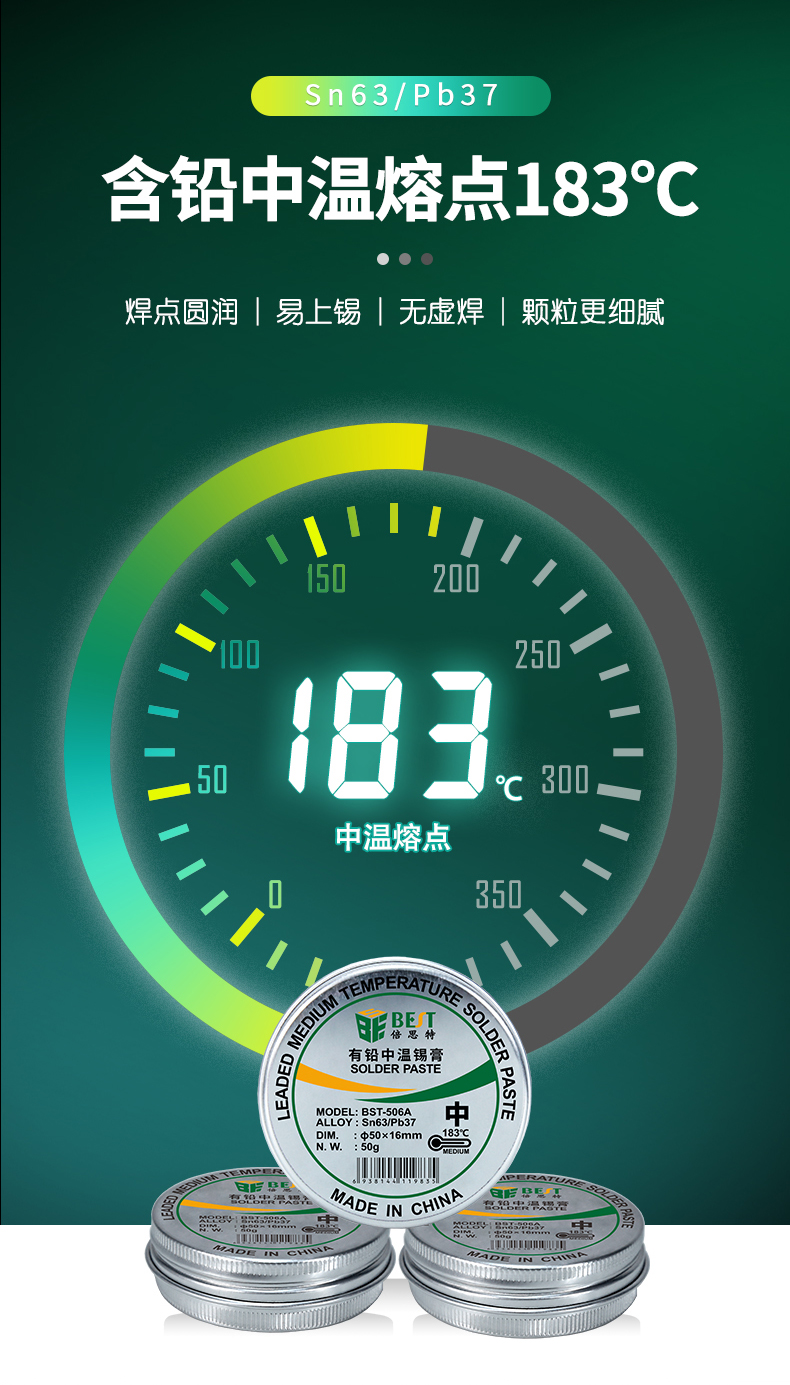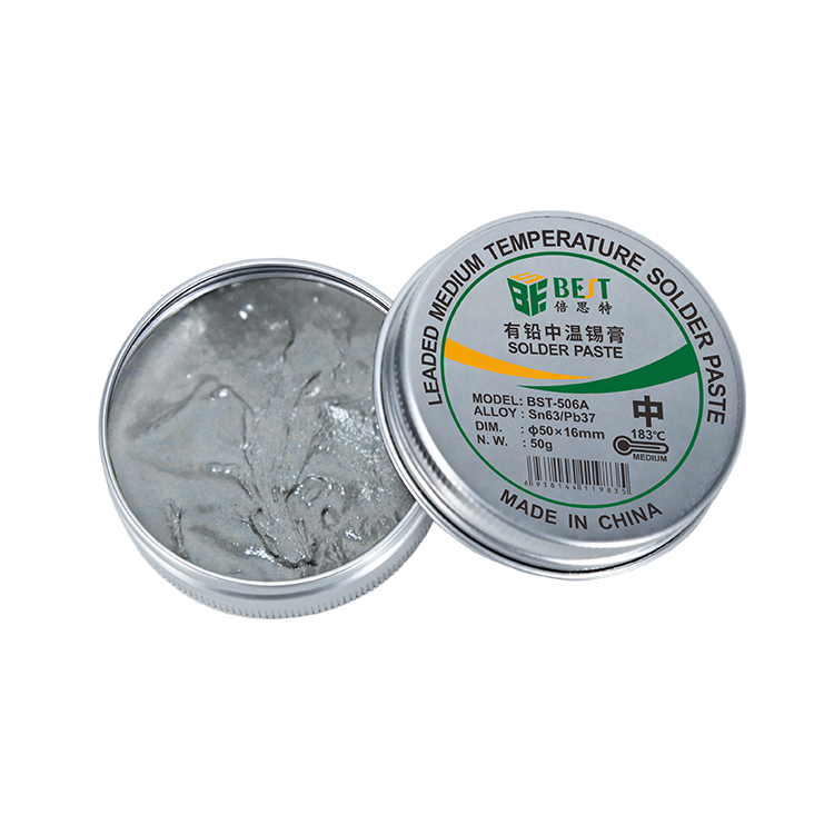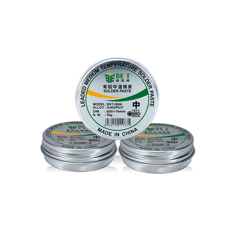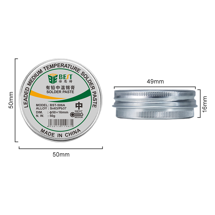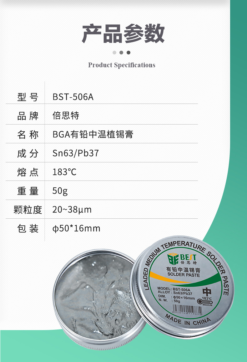 ? 產(chǎn)品名稱: 有鉛中溫錫膏? 產(chǎn)品型號(hào): BST-506A? 產(chǎn)品類別: 錫漿焊油系列? 產(chǎn)品成分: Sn63/Pb37? 產(chǎn)品重量: 50g