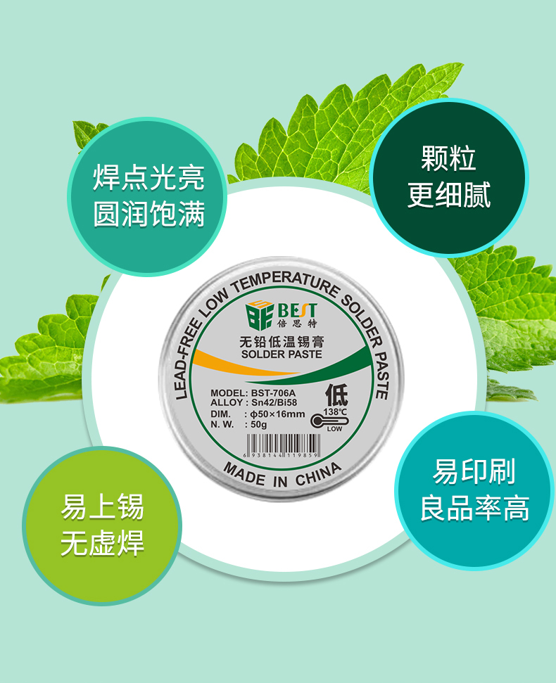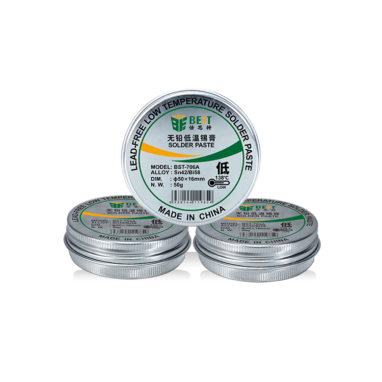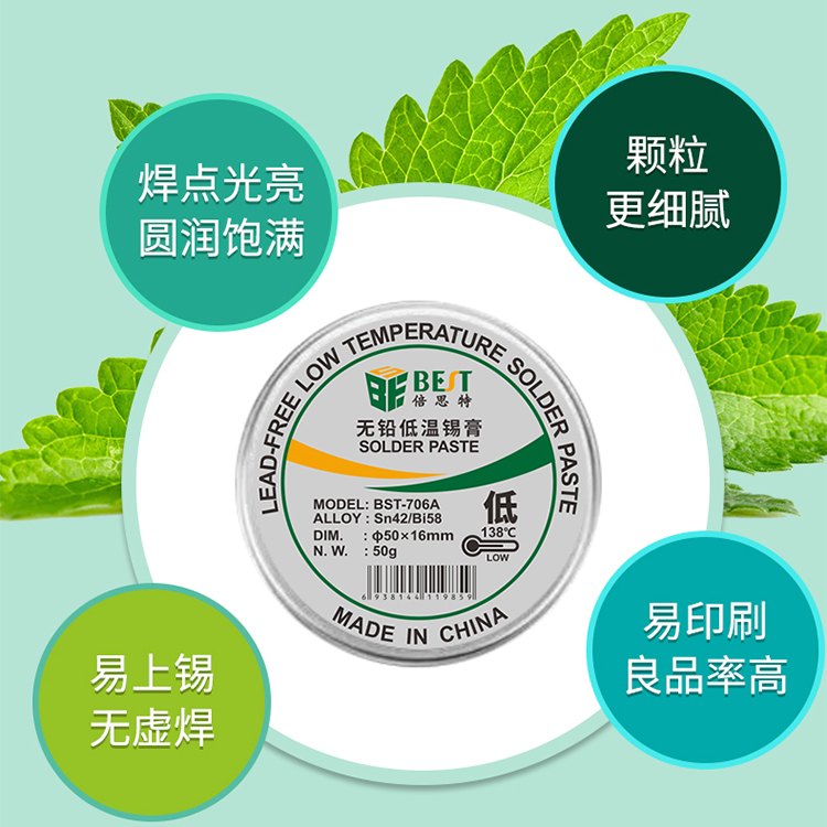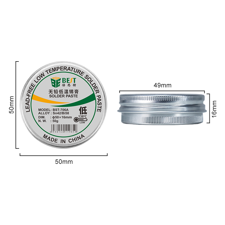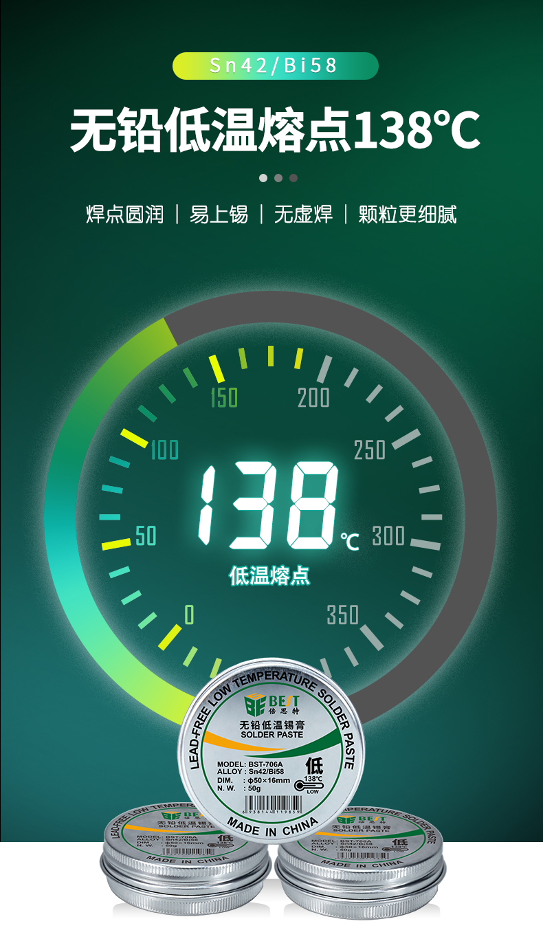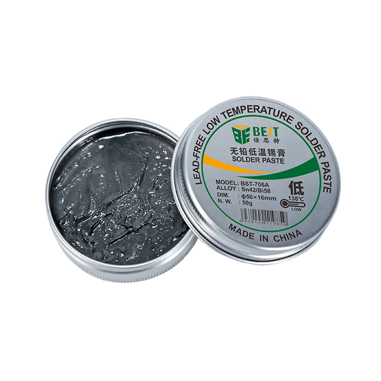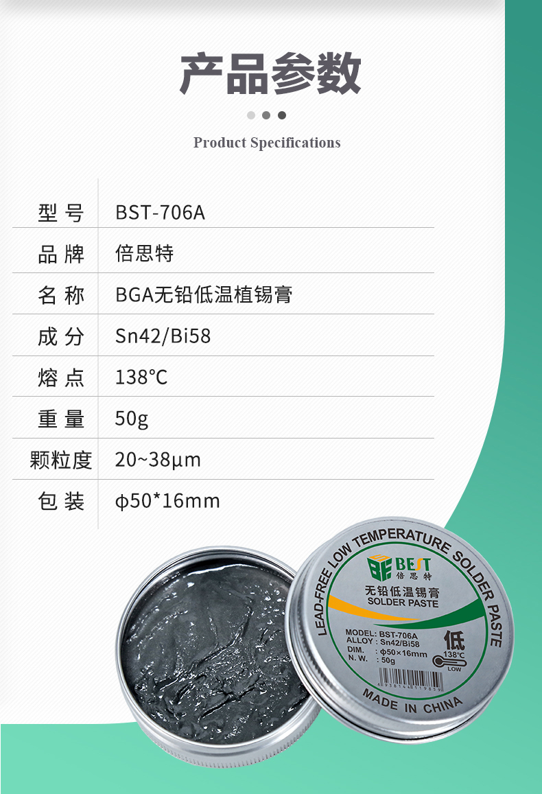 ? 產(chǎn)品名稱: 無鉛低溫錫膏? 產(chǎn)品型號: BST-706A? 產(chǎn)品類別: 錫漿焊油系列? 產(chǎn)品成分: Sn42/Bi58? 產(chǎn)品重量: 50g