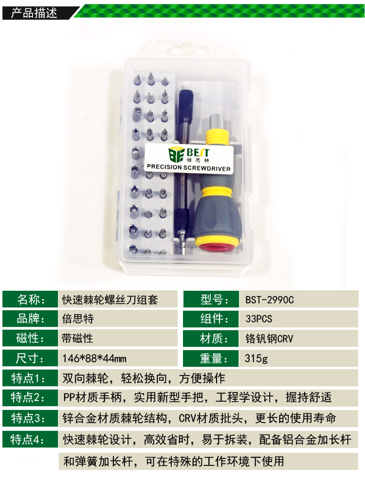 ? 產(chǎn)品名稱: 33件套 快速棘輪螺絲刀組套? 產(chǎn)品型號(hào): BST-2990C? 產(chǎn)品類別: 螺絲批系列