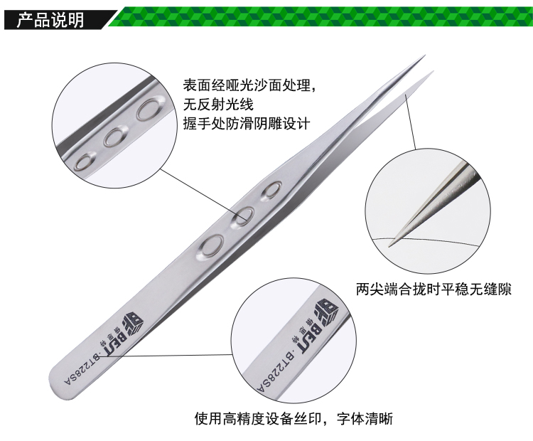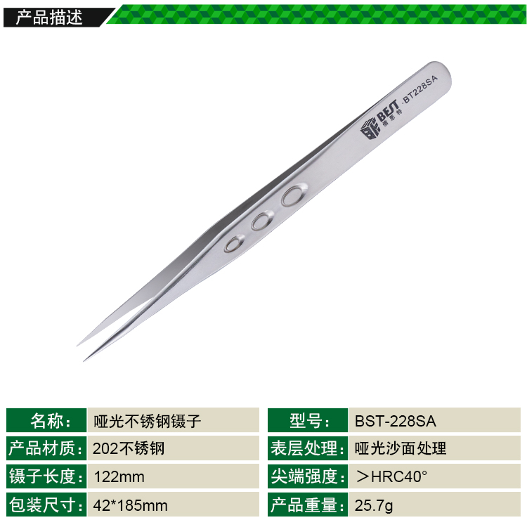 ? 產(chǎn)品名稱: 亞光沙面鑷子 不銹鋼鑷子? 產(chǎn)品型號: BST-228SA? 產(chǎn)品類別: 鑷子系列