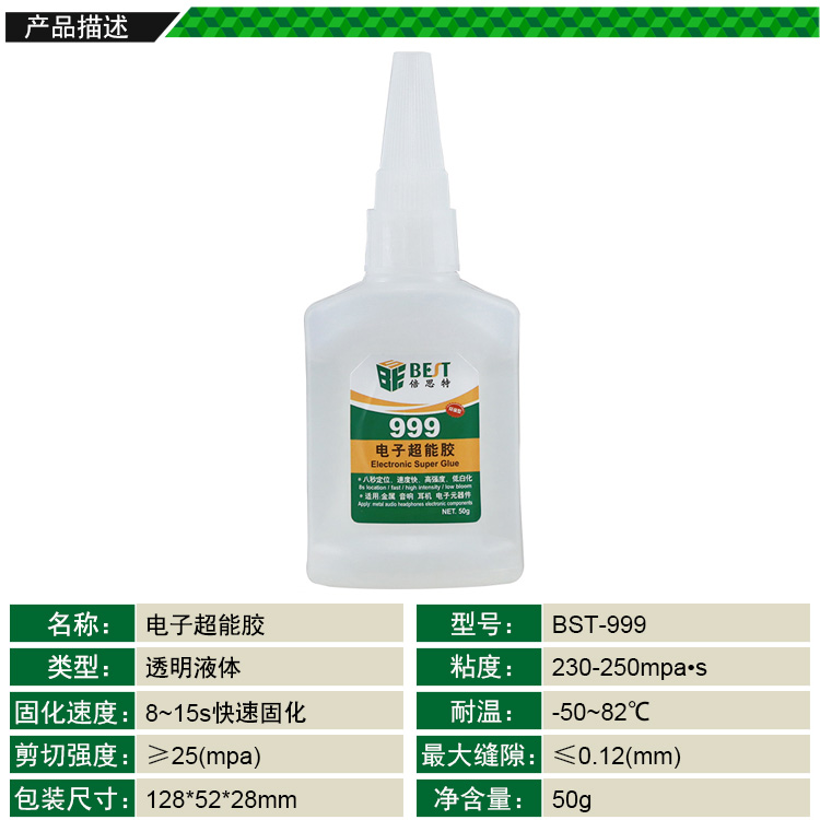 ? 產(chǎn)品名稱: 電子超能膠 瞬間膠? 產(chǎn)品型號(hào): BST-999? 產(chǎn)品類別: 膠水膠紙系列