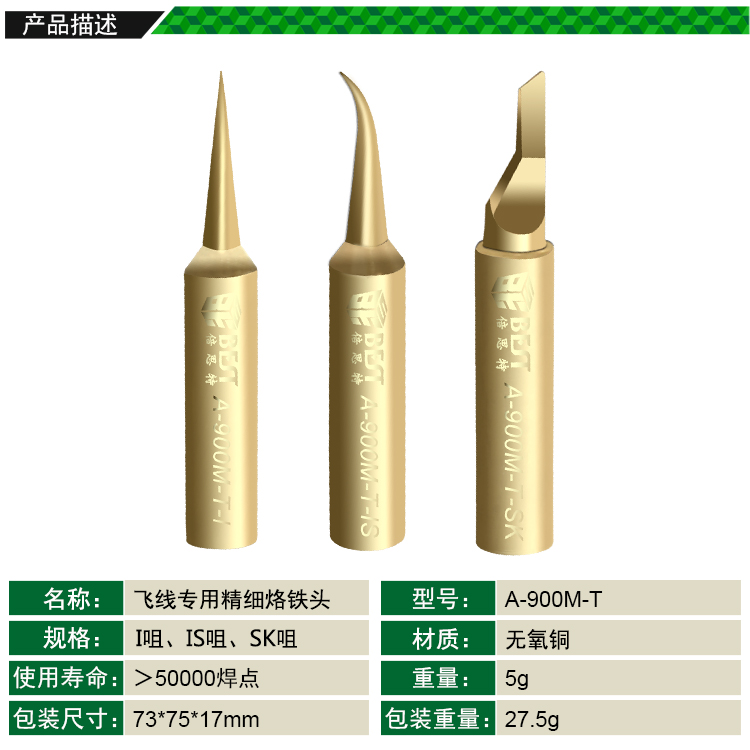 ? 產(chǎn)品名稱: 飛線專用精細(xì)烙鐵頭? 產(chǎn)品型號: A-900M-T? 產(chǎn)品類別: 烙鐵咀系列