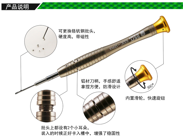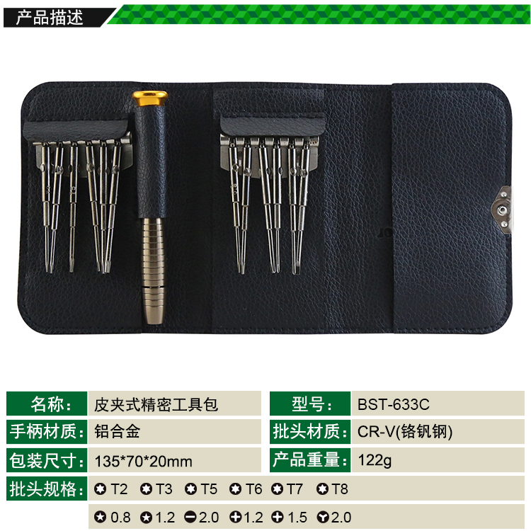 ? 產(chǎn)品名稱: 皮夾式精密工具包 13pcs? 產(chǎn)品型號: BST-633C? 產(chǎn)品類別: 螺絲批系列
