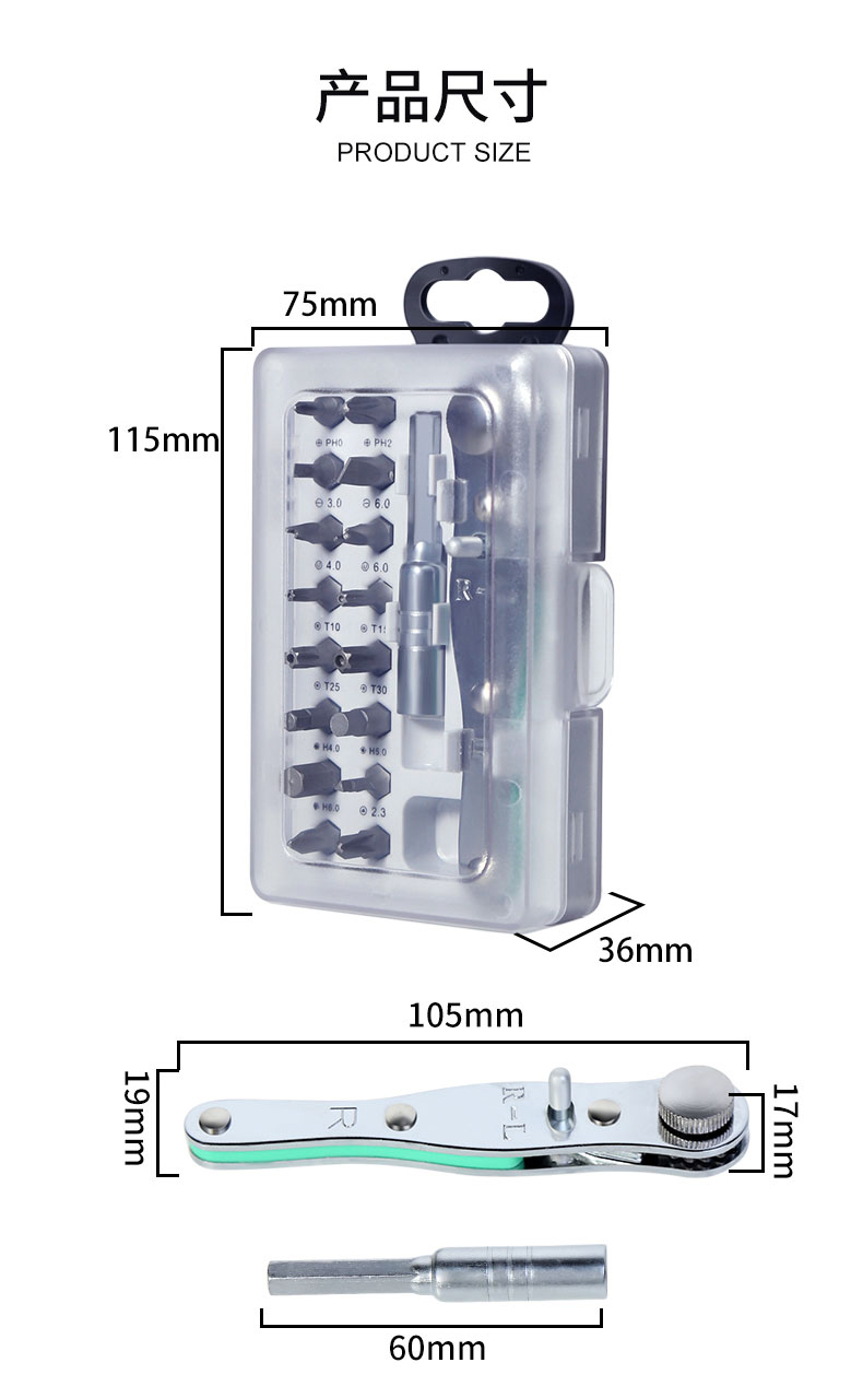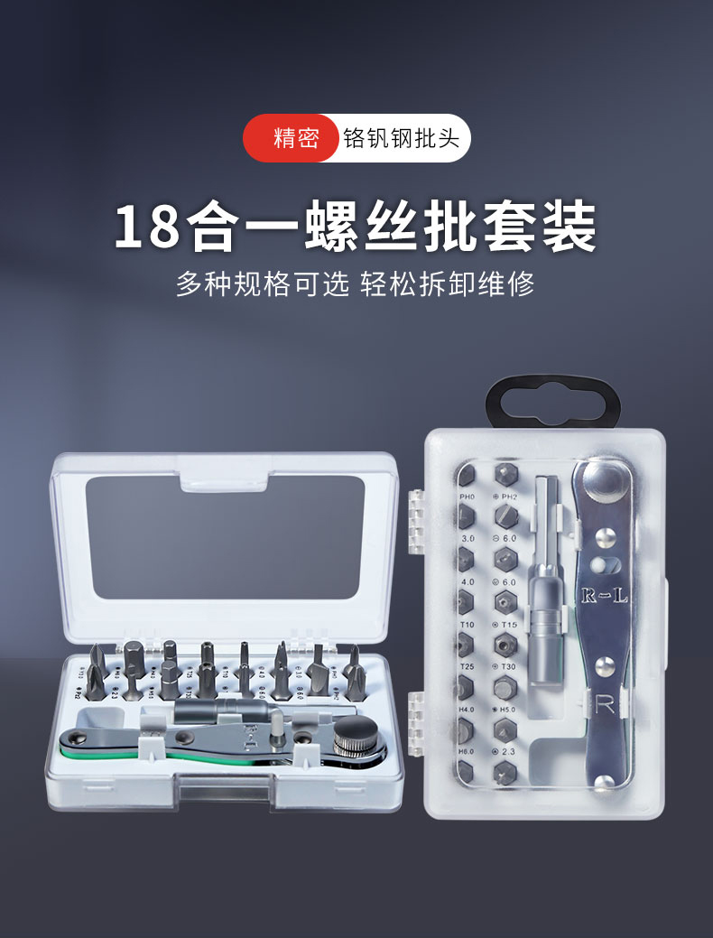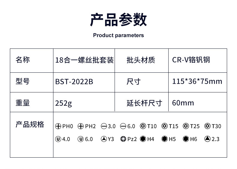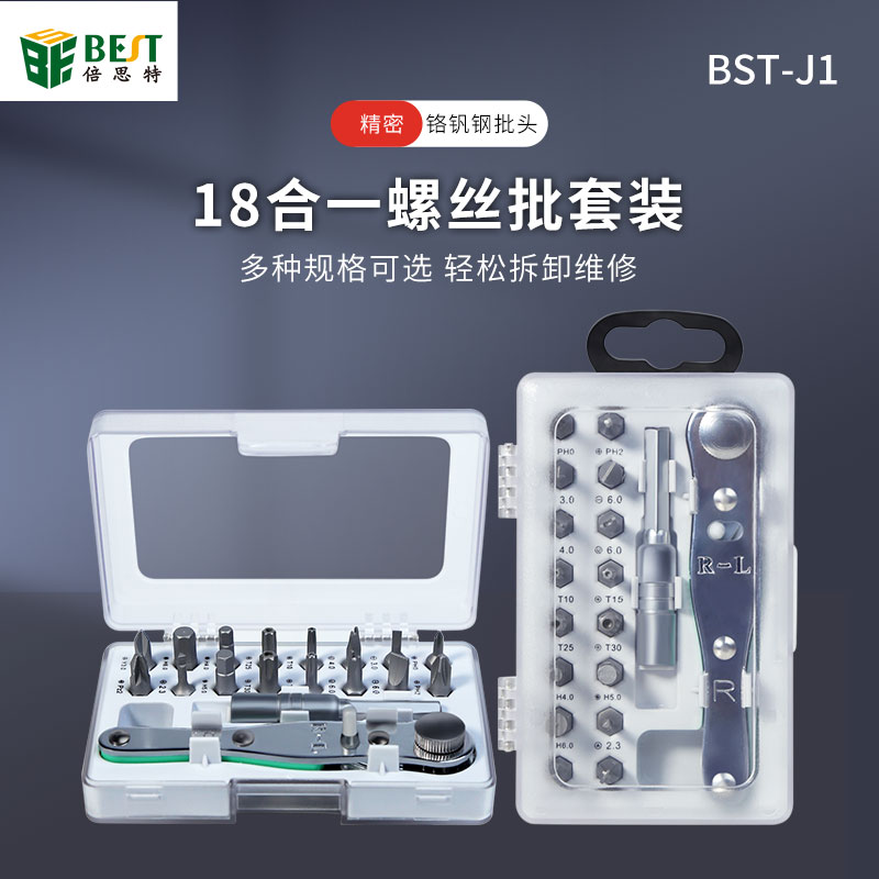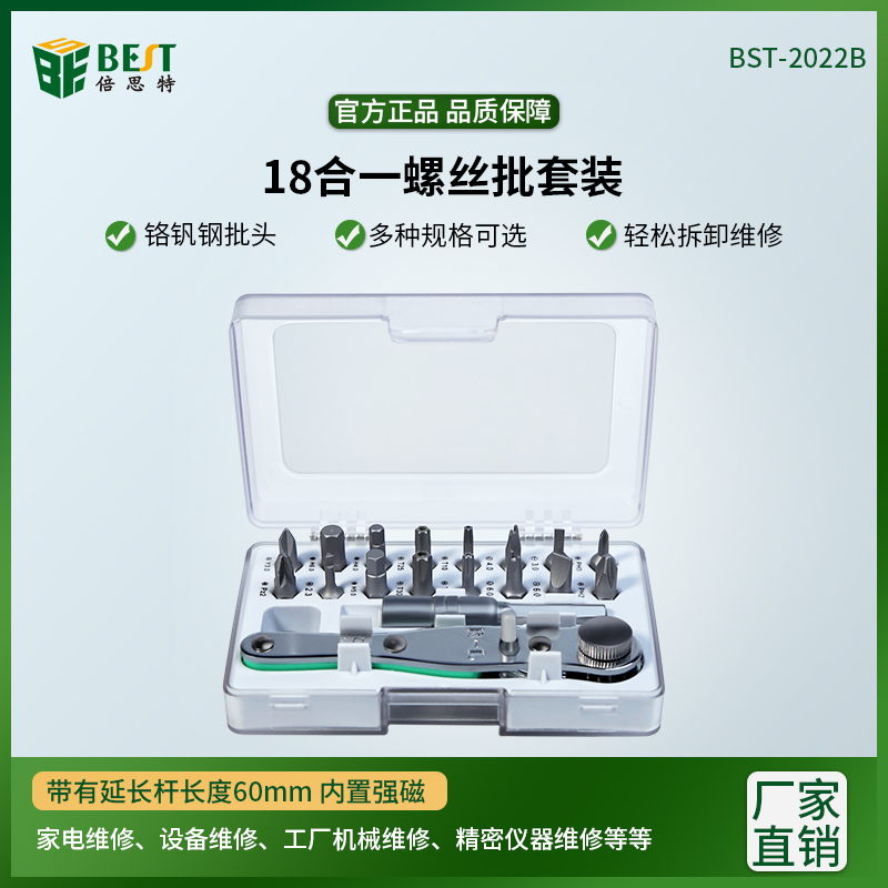 ? 產(chǎn)品名稱: 雙向棘輪18合一螺絲批套裝? 產(chǎn)品型號: BST-2022B? 產(chǎn)品類別: 套批系列