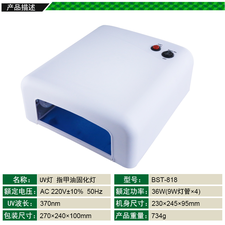 ? 產(chǎn)品名稱: UV燈 無(wú)影膠指甲油固化燈? 產(chǎn)品型號(hào): BST-818? 產(chǎn)品類別: 紫外燈系列