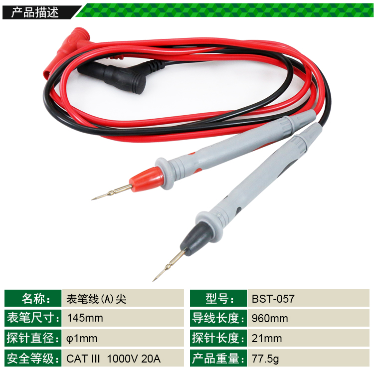? 產(chǎn)品名稱: 表筆線(A)尖? 產(chǎn)品型號(hào): BST-057? 產(chǎn)品類別: 表筆線系列