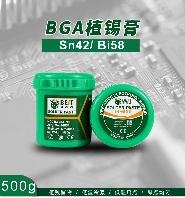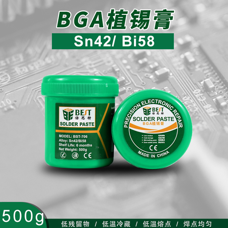 返回當前位置: 首頁 / 產(chǎn)品中心 / BST-706 無鉛錫漿 低溫錫漿 焊錫膏 BGA植錫膏 Sn42/Bi58 500g