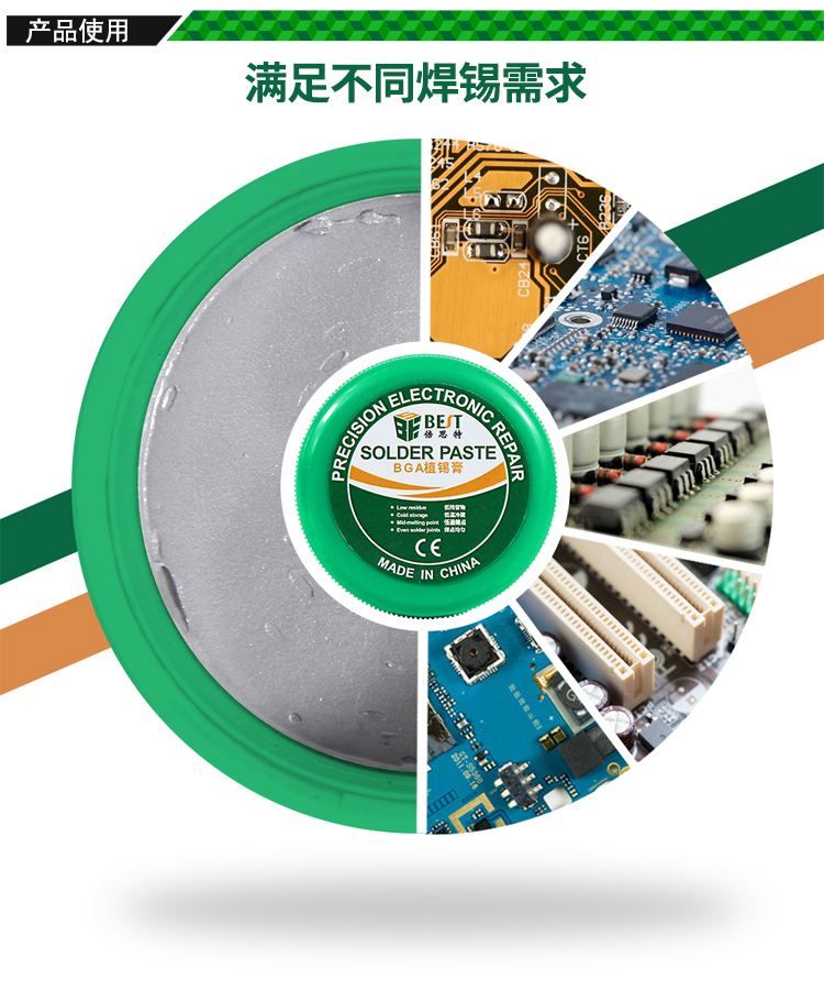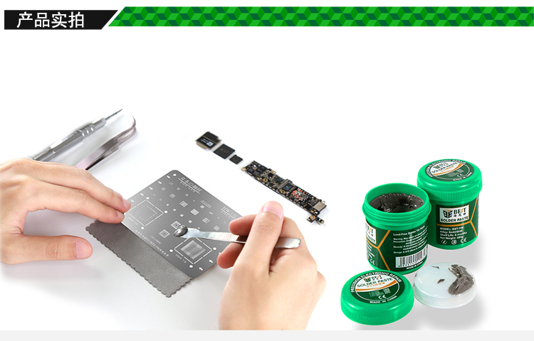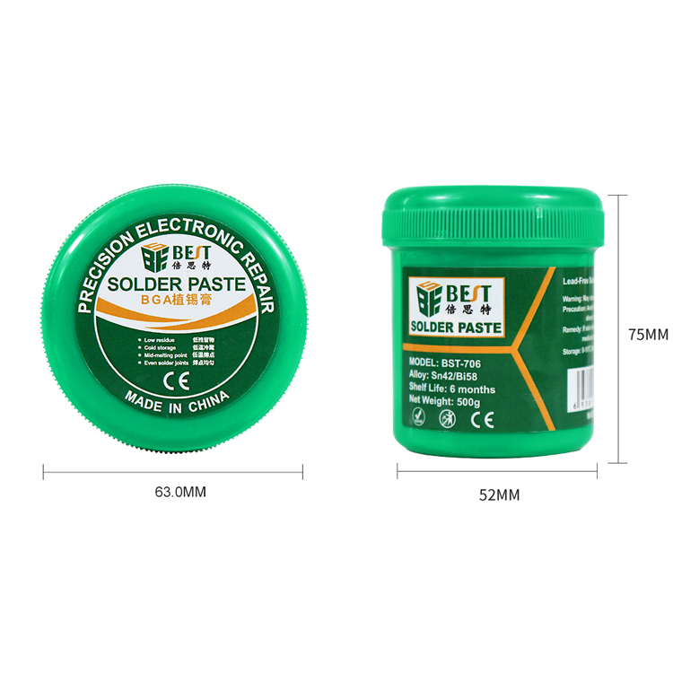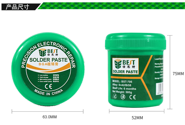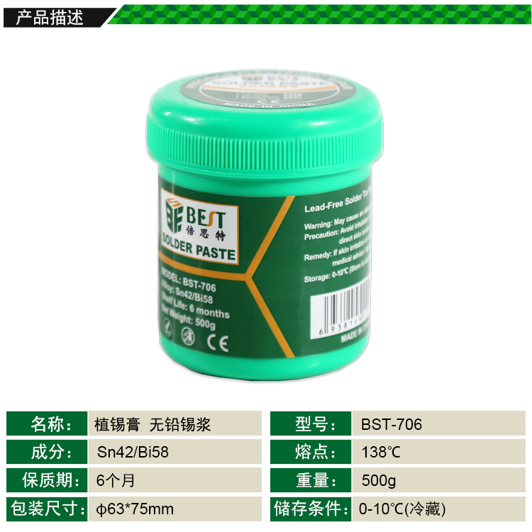 ? 產(chǎn)品名稱: 無鉛錫漿 焊錫膏 BGA植錫膏 500g? 產(chǎn)品型號: BST-706? 產(chǎn)品類別: 錫漿焊油系列? 產(chǎn)品成分: Sn42/Bi58? 產(chǎn)品重量: 500g