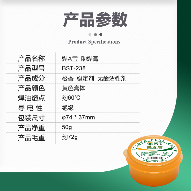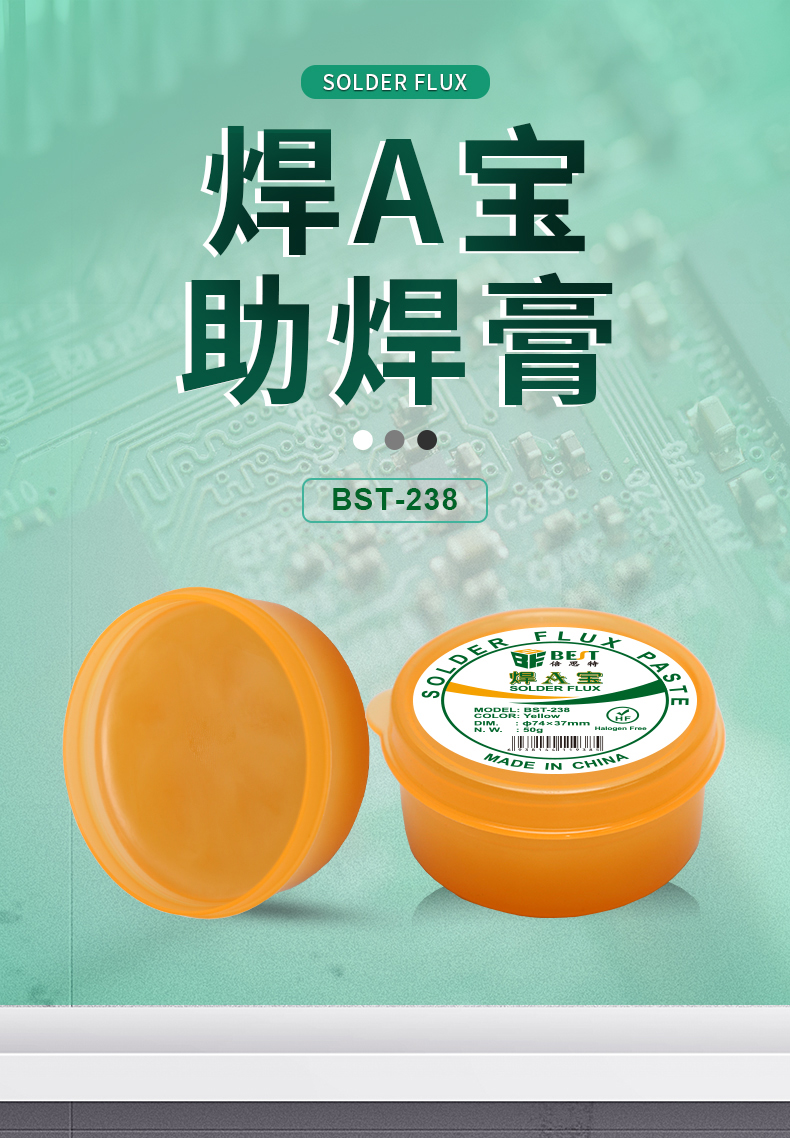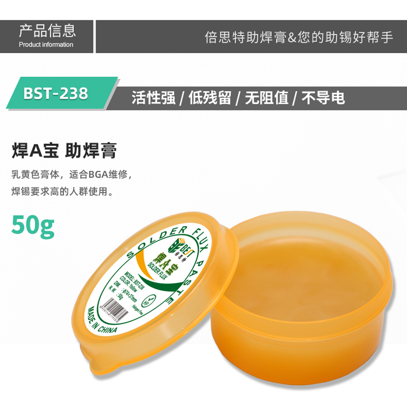 ? 產(chǎn)品名稱: 焊A寶50g 助焊膏? 產(chǎn)品型號: BST-238? 產(chǎn)品類別: 錫漿焊油系列