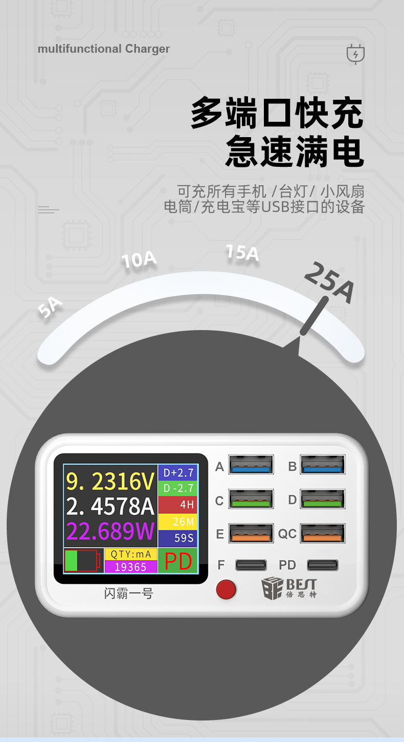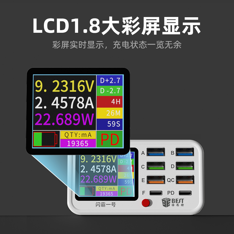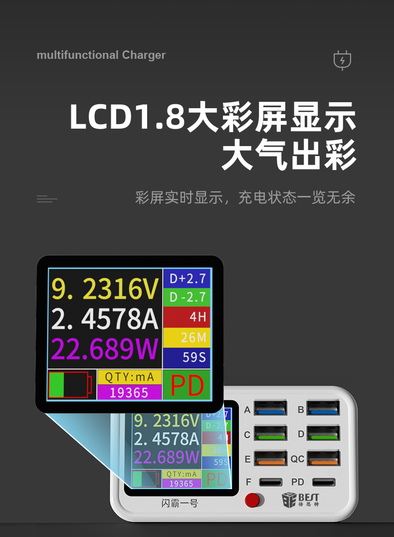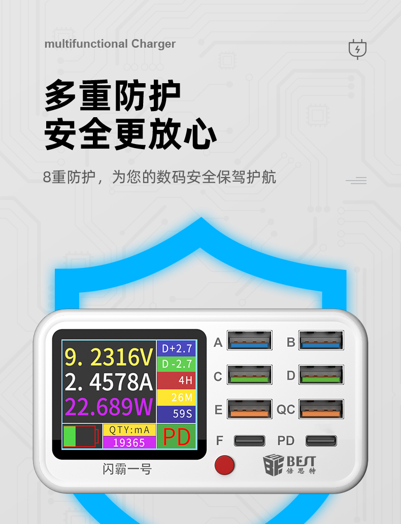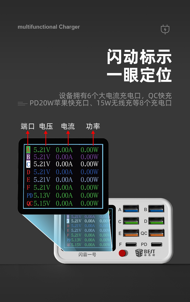 返回當(dāng)前位置: 首頁(yè) / 產(chǎn)品中心 / BST-S1 閃霸一號(hào) 多功能8口可視化USB充電器 極速快充 無(wú)線快充 檢測(cè)維修一體數(shù)顯充電器